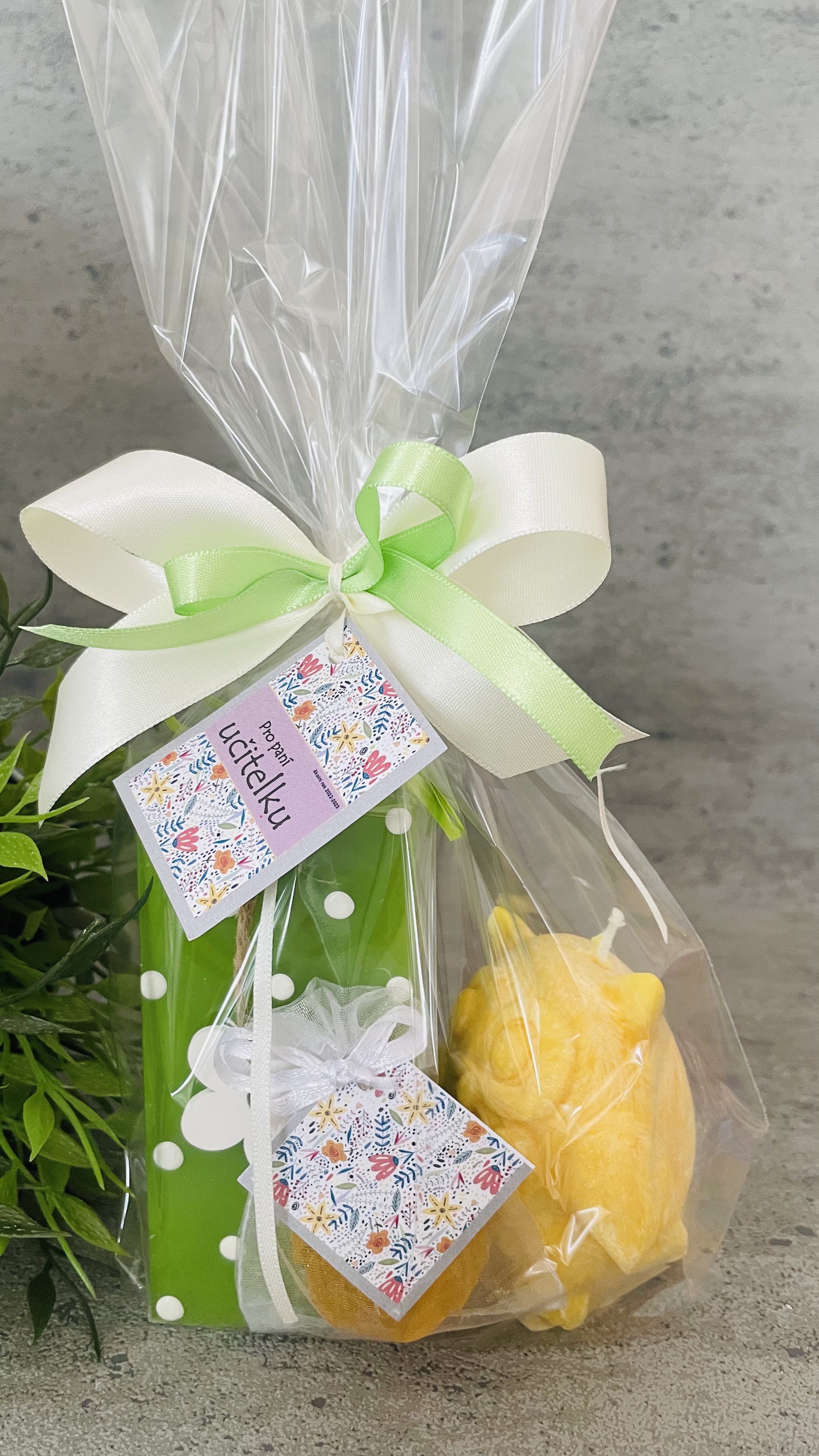 Dárkový balíček složeni:  vonná svíčka hranol + dřevěná přízdoba    55x55x120mm               glycerinové mýdlo vonné - 20g                palmová svíčka ve tvaru sovičky    celý popis